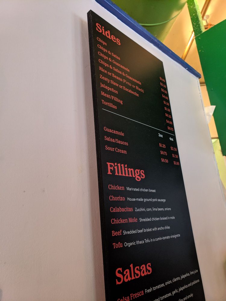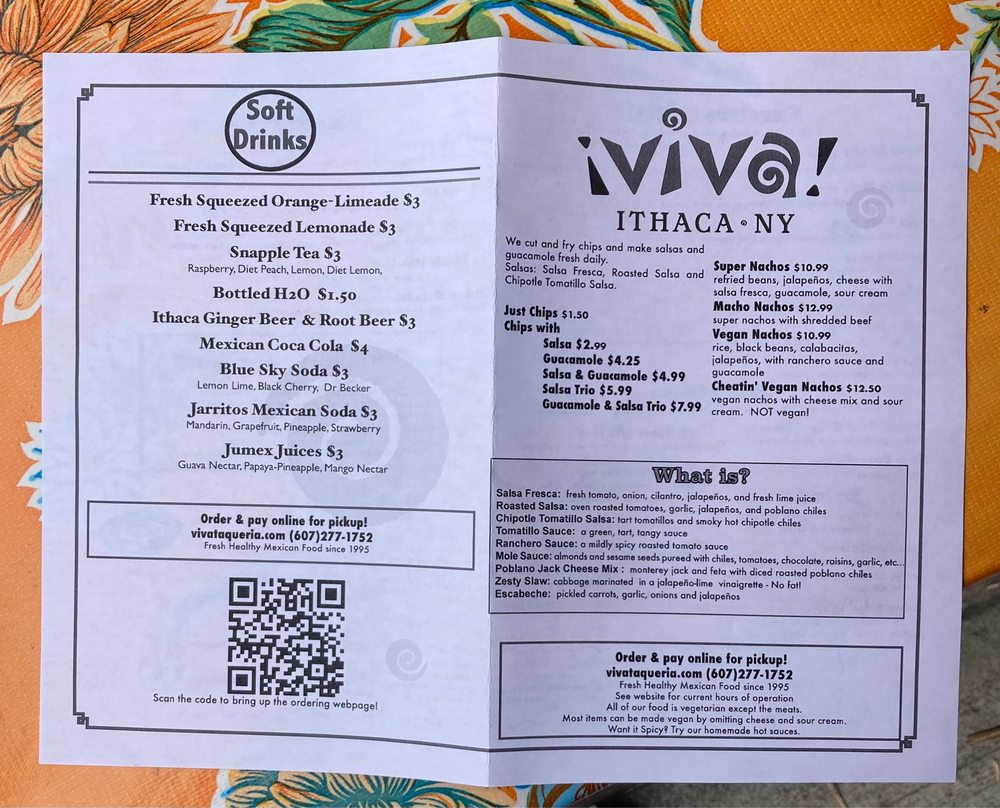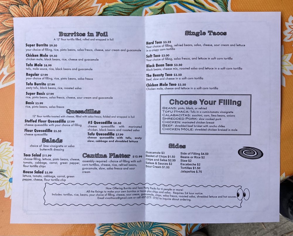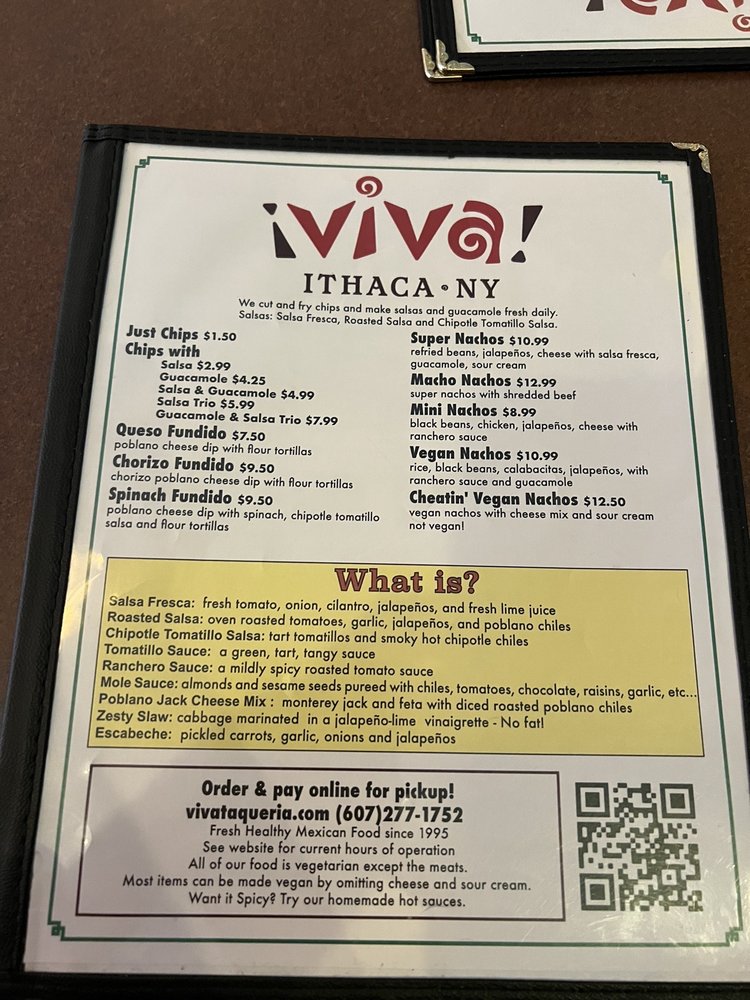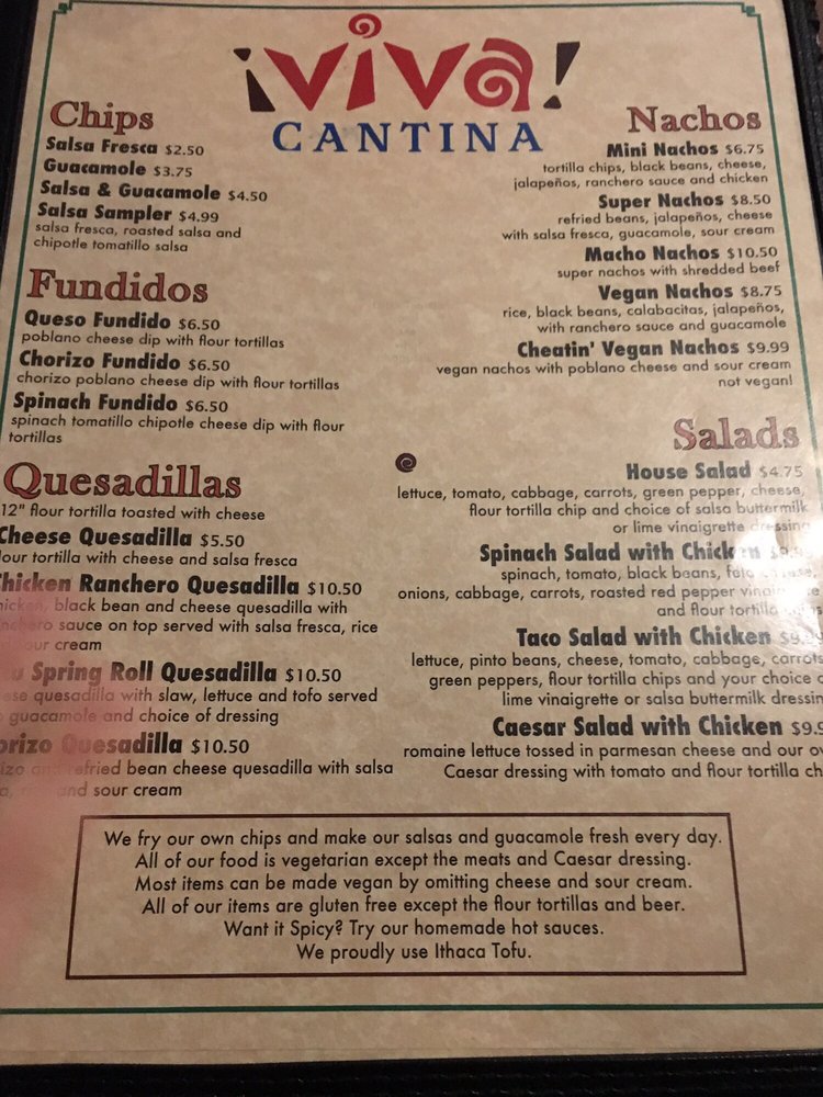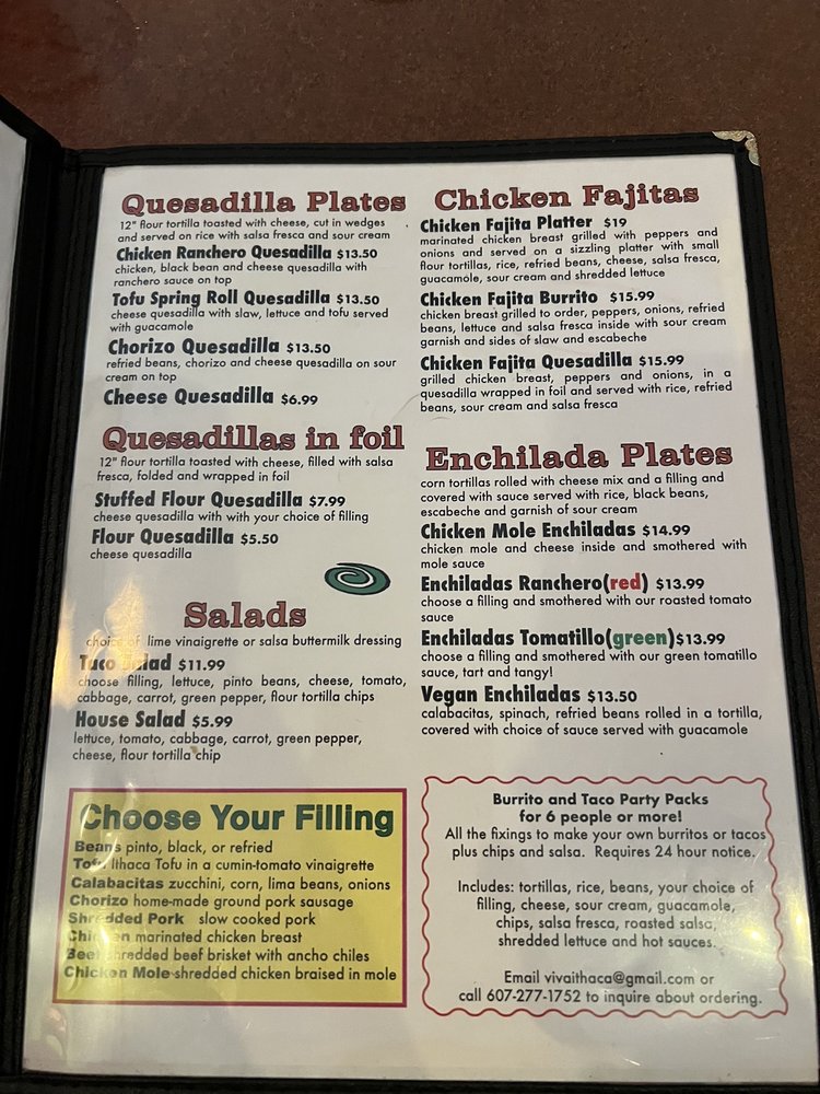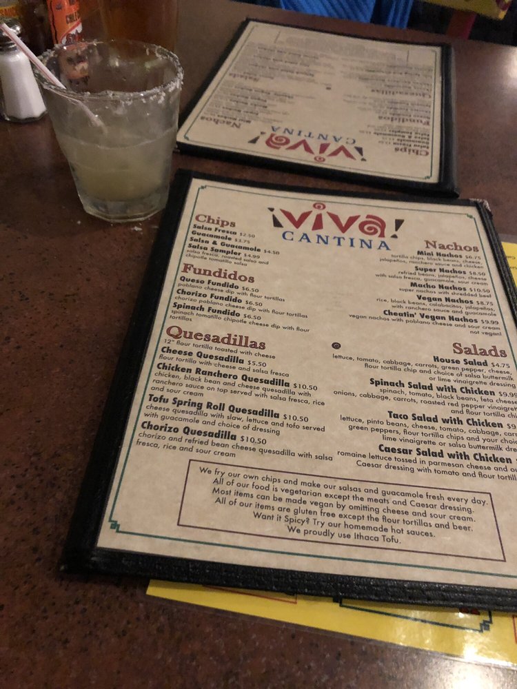 Introducing the menu at Viva Taqueria in Ithaca, NY, where customers rave about the authentic Mexican cuisine and welcoming atmosphere. Start with appetizers like Pork Posole, Chorizo Fundido, and hearty salads like Taco Salad and Caesar Salad with Chicken. Dive into the main dishes with a variety of Chips & Salsa options and loaded Nachos like Macho Nachos and Vegan Nachos. Customer favorites include the wrapped burrito, quesadillas, and margaritas. Enjoy the vibrant Hispanic ambiance, excellent service, and quick seating. Despite a few mixed reviews on wait times and vegan options, the overall experience is consistently praised for delicious food, strong drinks, and a lively atmosphere. Viva Taqueria is a go-to spot for satisfying Mexican cravings and a fun dining experience.