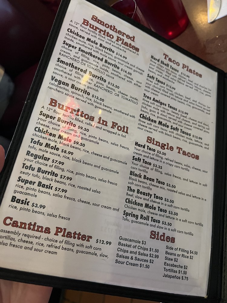 you choose the filling, with rice, pintos, cheese, sour cream, and guacamole inside, smothered with either ranchero or tomatillo sauce, slawand escabache on the side